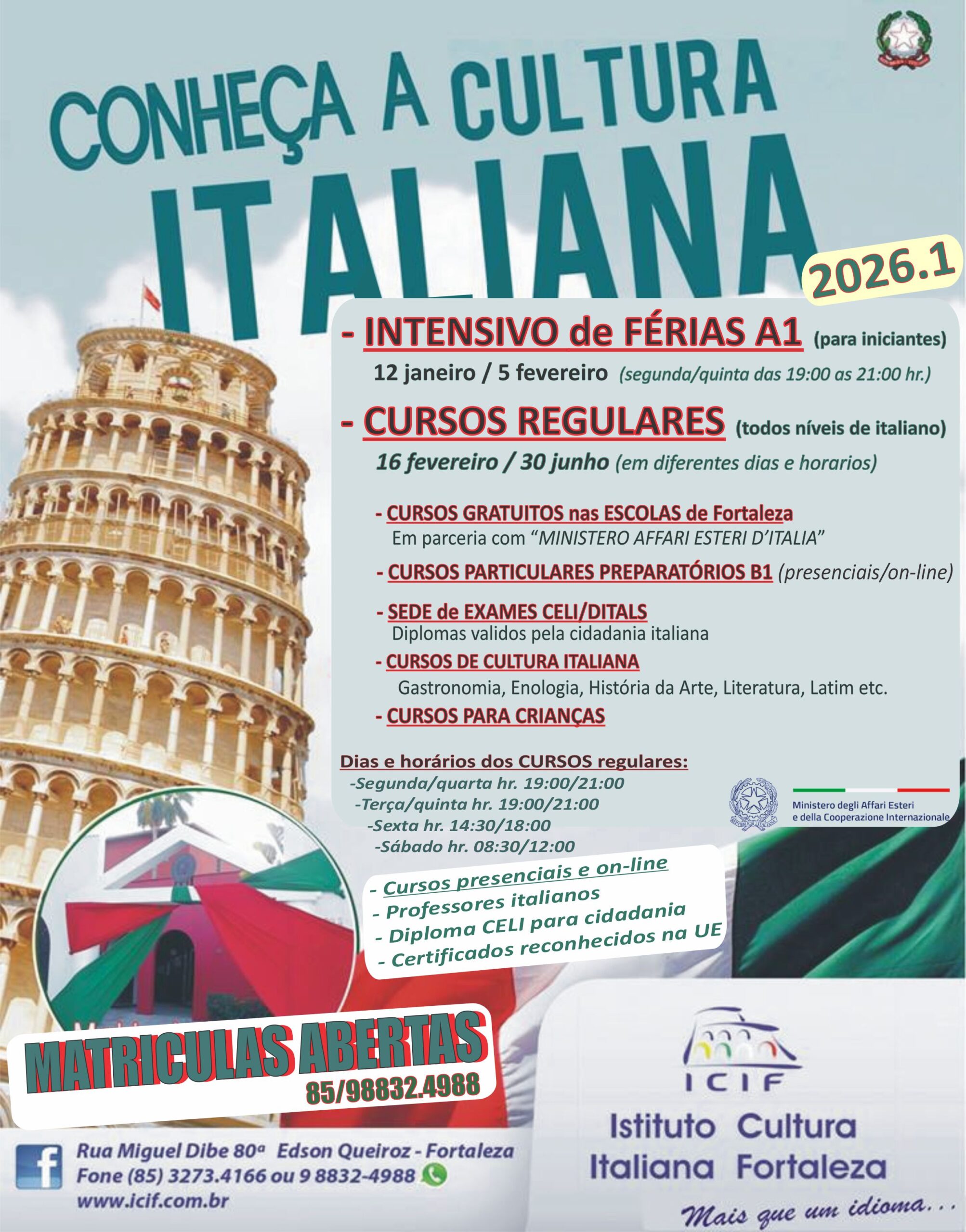 O único reconhecido pelo Governo Italiano no Ceará. Matricule-se já para os próximos cursos e veja porque o Italiano é mais que um idioma e o ICIF é mais que uma escola! Entre em contato!